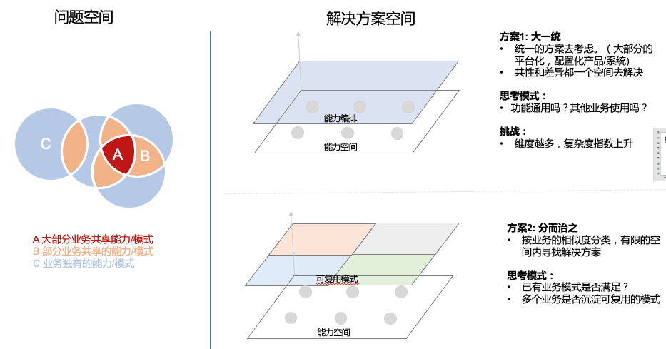 下图的左边描述是符合这样特征的问题空间, 平台和中台分别有两种不同的思路来解决: