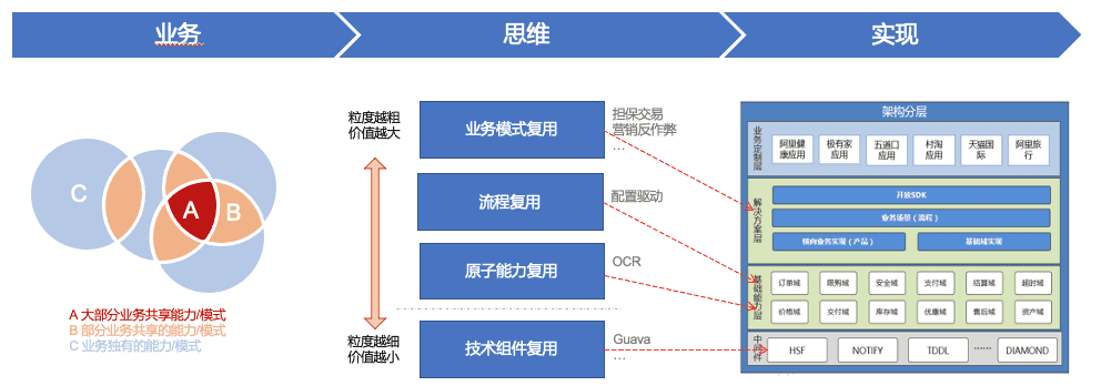 中台思路尝试对问题域进行划分,相似度最大的业务划分到一类进行考虑,在这个有效的问题空间寻找最优解。在中台思维下,复用性不再是单一的维度,而是不同”层”的复用,从下往上,复用的粒度越来越大,越来越有价值。